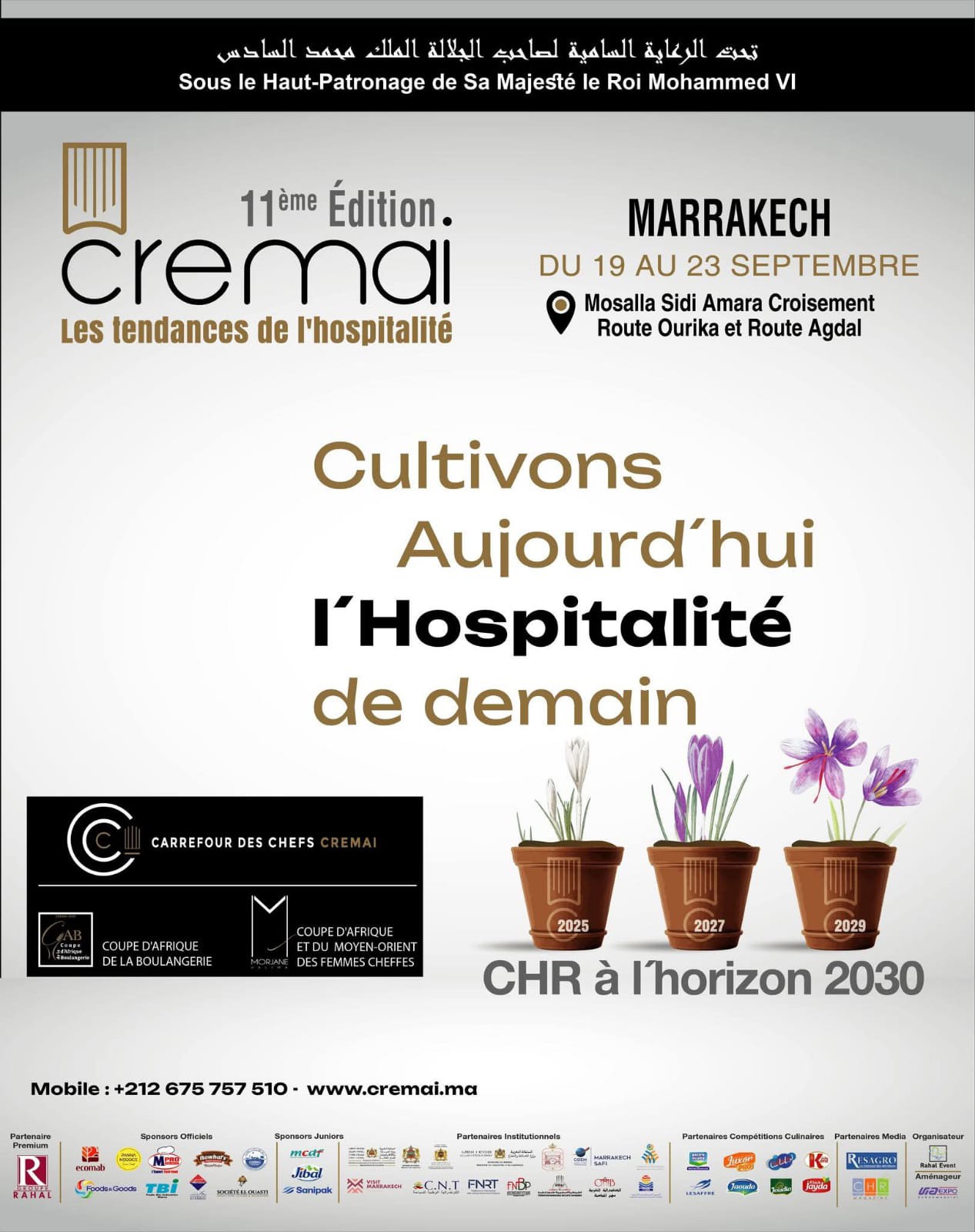 آربريس / بوشعيب خلدون : تنطلق بمدينة مراكش ما بين 19 و23 شتنبر 2025 فعاليات الدورة الحادية عشرة لمعرض الضيافة CREMAI، الذي ينظم تحت الرعاية السامية لصاحب الجلالة الملك محمد السادس نصره الله. ويعد هذا الحدث الأبرز في إفريقيا والشرق الأوسط في مجال الضيافة، فنون الطهي، والابتكار في الصناعات الغذائية، حيث يجمع أزيد من 750 علامة تجارية دولية ووطنية وأكثر من 20 ألف زائر مهني من مختلف أنحاء العالم.
