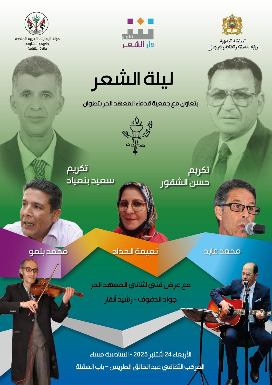 آربريس / بتعاون مع جمعية قدماء المعهد الحر، تنظم دار الشعر بتطوان ليلة جديدة من ليالي الشعر، يوم الأربعاء 24 شتنبر الجاري، في فضاء المركب الثقافي عبد الخالق الطريس بمدينة تطوان، ابتداء من الساعة السادسة مساء. ويشهد هذا اللقاء تكريم أستاذ الأجيال والمربي الراحل حسن الشقور، المدير السابق للمعهد الحر بتطوان. بينما يشارك في ليلة الشعر هاته الشاعر محمد عابد والشاعرة نعيمة الحداد والشاعر محمد بلمو، مع عرض فني لثنائي المعهد الحر الأستاذ جواد الدفوف والأستاذ رشيد أنقار. مثلما يشهد اللقاء تكريم الشاعر سعيد بنعياد، أحد خريجي المعهد، في بداية الثمانينيات.