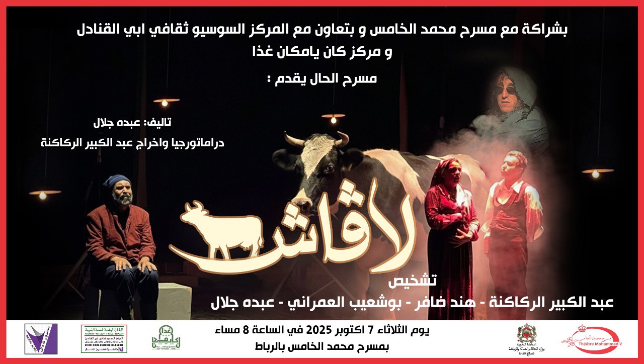 آٌربريس/ بشراكة مع مسرح محمد الخامس وبتعاون مع المركز السوسيوثقافي “أبي القناديل” ومركز “كان يامكان غدا”، تقدم فرقة مسرح الحال بالرباط مسرحيتها الجديدة “لا فاش”، وذلك برسم الموسم 2026/2025، لمؤلفها الفنان “عبده جلال”،
