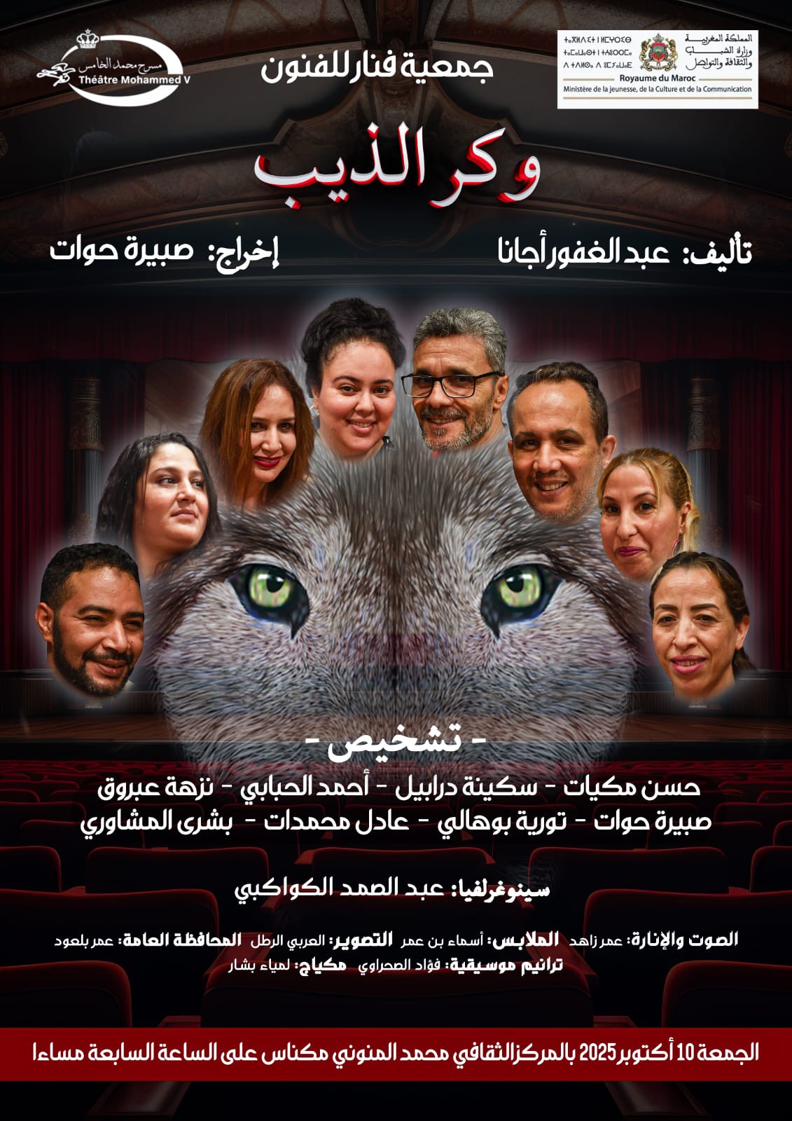 آربريس/ بدعم من وزارة الشباب والثقافة والتواصل وبشراكة مع المسرح الوطني محمد الخامس، تقدم جمعية “فنار للفنون”، عرضين جديدين لمسرحية “وكر الذيب”، يوم الخميس 9 اكتوبر بدار المواطن، بمدينة تيفلت على الساعة سابعة مساء، ويوم الجمعة 10 اكتوبر، بالمركز الثقافي محمد المنوني بمدينة مكناس في نفس التوقيت.
