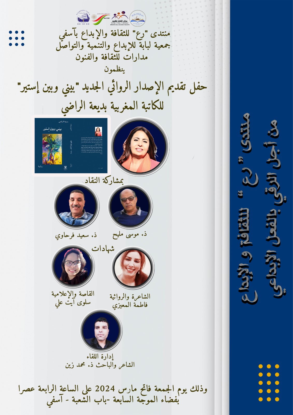 ذ. محمد زين / ينظم كل من منتدى “رع” للثقافة والإبداع وجمعية لبابة للإبداع والتنمية والتواصل ومدارات للثقافة والفنون في سياق الأنشطة الأدبية الخاصة بالتشبيك الجهوي الثقافي لجهة مراكش–أسفي، حفل تقديم الإصدار الروائي الجديد “بيني وبين إستير“، للكاتبة المغربية بديعة الراضي، بمشاركة الناقدين ذ. موسى مليح وذ. سعيد فرحاوي. ومن فقرات هذا الاحتفاء، تقديم شهادتين في حق المحتفى بها، لكل من الشاعرة والروائية فاطمة المعيزي والقاصة والإعلامية سلوى آيت علي، كما سيشرف الباحث والشاعر محمد زين على إدارة هذه الجلسة الأدبية.