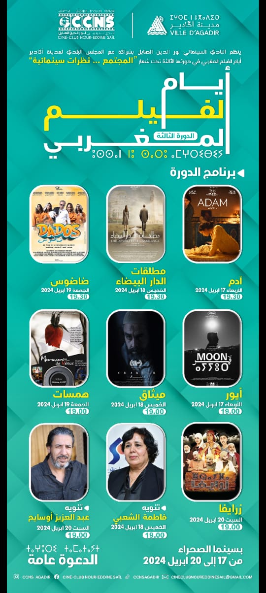 آربريس/ أكادير ـ ابراهيم فاضل / تحت شعار “المجتمع نظرات سينمائية” تحتضن سينما صحراء بحي تلبرجت بأكادير، فعليات النسخة الثالثة لأيام الفيلم المغربي التي انطلقت فعالياتها اليوم الاربعاء 17 ابريل 2024 وسيستمر الى يوم السبت 20 ابريل.