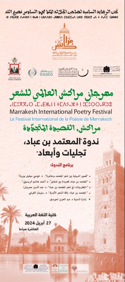 تنعقد الندوة الفكرية، التي يديرها الأستاذ عبد العزيز لحويدق، تحت عنوان ” المعتمد بن عباد، دلالات و أبعاد” بكلية اللغة العربية التابعة لجامعة القاضي عياض يوم السبت 27 أبريل 2024 في الساعة (10) العاشرة صباحا، وفق البرنامج الآتي: