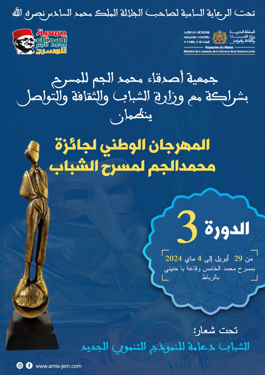 آربريس / نظمت جمعية أصدقاء محمد الجم للمسرح، عشية يوم الاثنين 22 أبريل 2024، برواق محمد الفاسي بالرباط، ندوة صحافية سلطت فيها الضوء على الدورة الثالثة للمهرجان الوطني لمسرح الشباب، التي ستقام تحت الرعاية السامية لجلالة الملك محمد السادس نصره الله، بشراكة مع وزارة الشباب والثقافة والتواصل، من 29 أبريل إلى 04 ماي 2024، بمسرح محمد الخامس وقاعة باحنيني بالرباط.