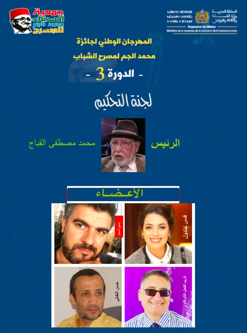 وأعلنت إدارة المهرجان عن أسماء أعضاء لجنة التحكيم التي ستبتّ في العروض المسرحية الإثني عشر الممثلة لمختلف جهات المملكة. وتضم اللجنة في عضويتها كلا من الباحث الأكاديمي والناقد الدكتور محمد مصطفى القباج (رئيسا) والممثلة قدس جندول، والممثل والمخرج ياسين أحجام، والمؤلف والمخرج كريم الفحل الشرقاوي، والخبير في التدبير المسرحي حسن النفالي (أعضاء).