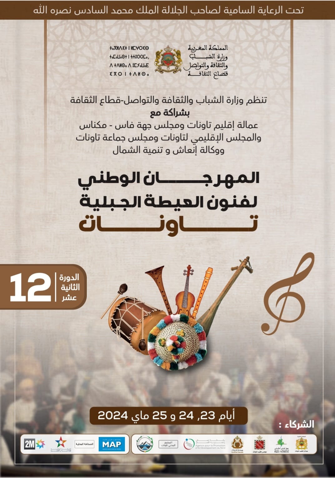 آربريس /تحت الرعاية السامية لصاحب الجلالة الملك محمد السادس نصره الله وأيده، تنظم وزارة الشباب والثقافة والتواصل – قطاع الثقافة، بتعاون مع عمالة إقليم تاونات مجلس ومجلس جهة فاس مكناس، والمجلس الإقليمي لتاونات، ومجلس جماعة تاونات، ووكالة إنعاش وتنمية الشمال، الدورة الثانية عشرة للمهرجان الوطني لفنون العيطة الجبلية أيام 23-24-25 ماي 2024، بمدينة تاونات، وذلك تنفيذاً لاستراتيجيها الرامية إلى إبراز الموروث الثقافي والفني المغربي المتنوع، من خلال مجموعة من الآليات والتدابير، وخصوصاً منها المهرجانات، ونظراً للقيمة الثقافية، والفنية، والتاريخية، والسياحية لمدينة تاونات ومحيطها، ووعياً من الوزارة بالخصوصية الثقافية والفنية لفنون العيطة الجبلية، وتجدرها في مناطق واسعة من شمال المملكة المغربية، كون أن هذا التراث الموسيقي الأصيل يعتبر أحد مكونات الموروث الثقافي الوطني المتنوع، وشكلا من الأشكال الفنية والتراثية المعبرة عن الهوية الثقافية المغربية .