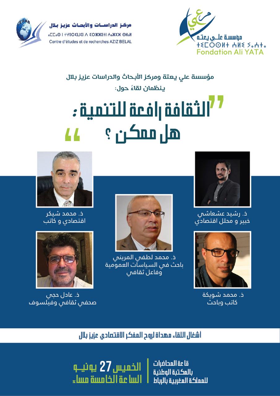 آربريس/ تنظم مؤسسة علي يعته بشراكة مع مركز الأبحاث والدراسات – عزيز بلال، لقاء تحت عنوان الثقافة رافعة للتنمية .. هل ممكن ؟ وذلك يوم الخميس 27 يونيو الجاري، ابتداء من الساعة الخامسة مساء، بقاعة المحاضرات بالمكتبة الوطنية بالرباط.