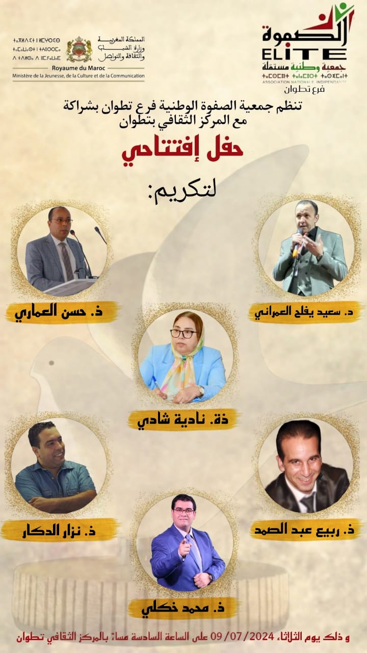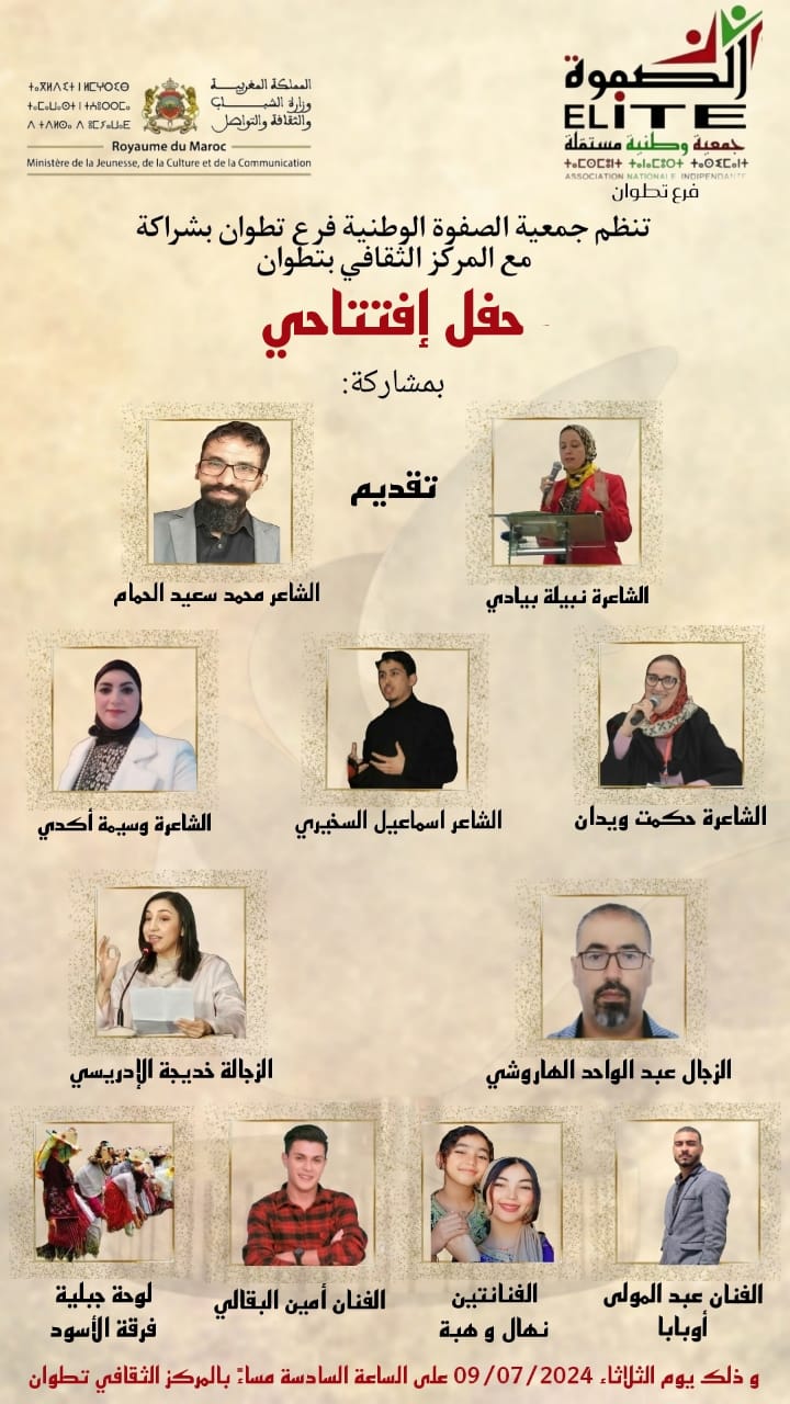 آربيس ـ بوشعيب خلدون / تنظم جمعية الصفـــوة الوطنــية فــرع تطــوان يوم الـثلاثاء 09 يـوليـوز 2024 حفـلا افتـتاحيا بـمناسبة انـطلاق أنشطـتها الثقـافيـة والفنـية والاجتمـاعية وذلك بشراكة مع المركز الثقافي بتطوان، وسيعـرف الحـفــل عددا من الفقـرات المتنوعـــة أبـرزهــا فقرة التكـريمات وتخص عددا من الشخـصيات المحـلية والوطـنية، ويتقدم هذه الأسماء الفنان التكيلي والاعلامي رئيس تحرير ومؤسس مجلة اربريس الأستاذ بوشعيب خلدون والأستاذة نادية شادي النائبة الأولى لرئيس المجلس الأدبي، والأستاذ سعيد يفلح العمراني دكتور جامعي و ناقد في الشعر النسائي، والأستاذ محمد الخكلي صحفي بقناة tele maroc و الرئيس المركزي لجمعية الصفوة الوطنية بالدار البيضاء، والأستاذ حسن العماري مدير السجن المحلي بتطوان، والأستاذ نزار الدكار إطار تربوي وفاعل جمعوي، والأستاذ ربيع عبد الصمد فنان مسرحي وسنمائي. وسيتخلل الحفل مجموعة من الفقرات الشعرية و الزجلية والفنية والغنائية.
