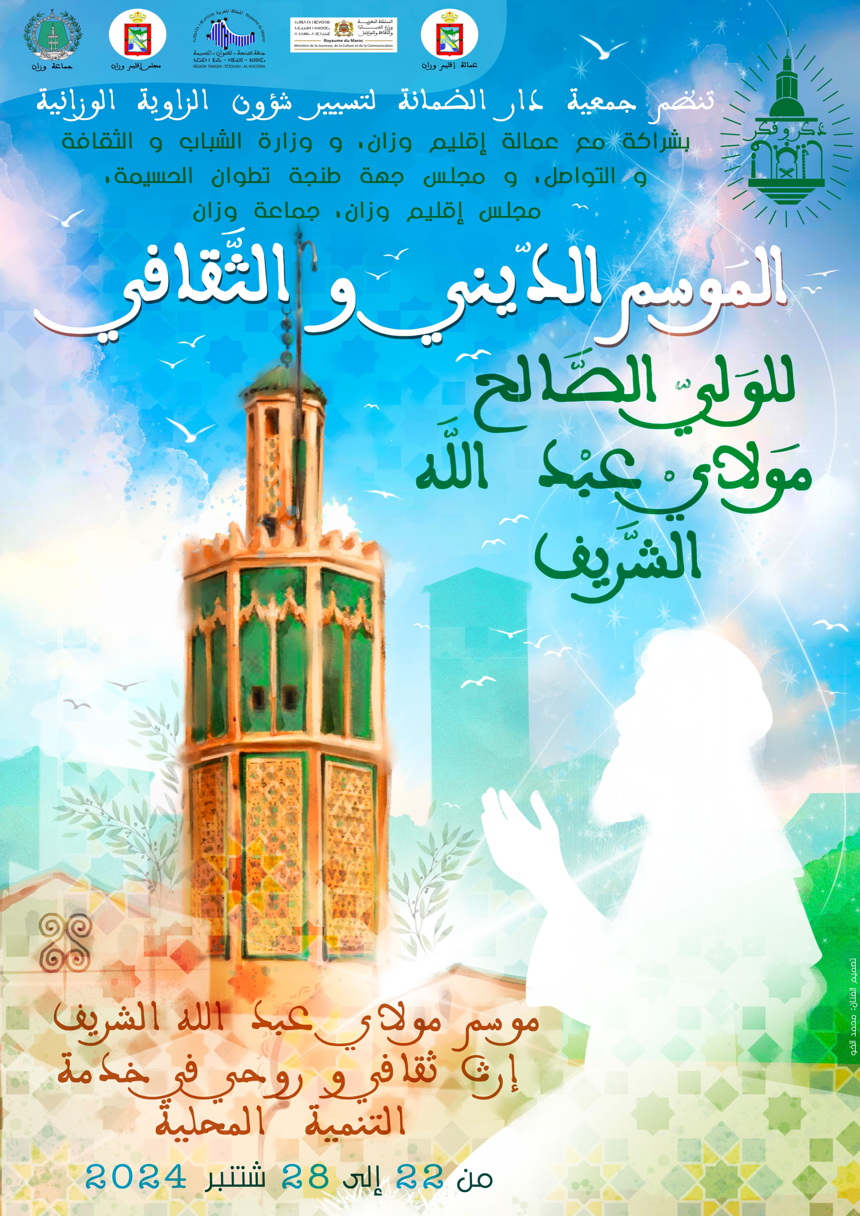 وبدعم من عمالة إقليم وزان، وبشراكة مع وزارة الشباب والثقافة والتواصل، ومجلس جهة طنجة تطوان الحسيمة، والمجلس إقليم وزان، وجماعة وزان، والجماعات الترابية بالإقليم، تنظم جمعية دار الضمانة لتسيير شؤون الزاوية الوزانية – تحت إشراف الزاوية الوزانية – : ” الموسم الديني والثقافي للولي الصالح مولاي عبد الله الشريف بوزان” خلال الفترة الممتدة من 18 إلى24 ربيع الأول 1446هـ الموافق ل: 22 إلى 28 شتنبر 2024م.