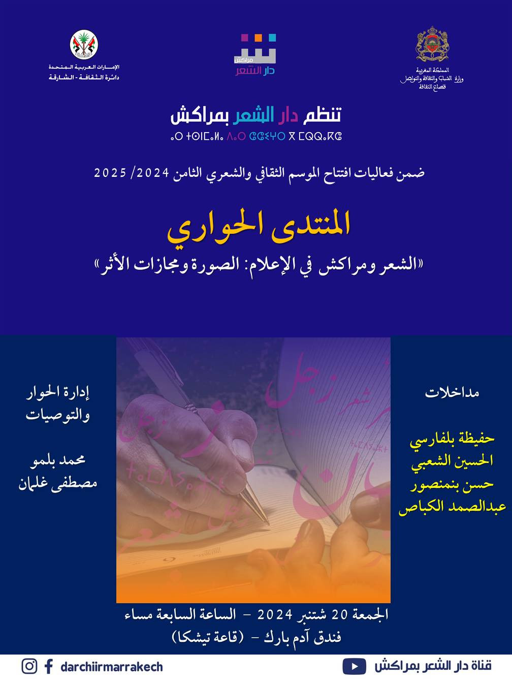 ويشهد المنتدى الحواري مداخلات لعدد من الشعراء والإعلاميين والباحثين: حفيظة الفارسي، الحسين الشعبي، محمد بلمو، عبدالصمد الكباص، حسن بنمنصور، مصطفى غلمان. ويسعى المشاركون الى تحديد أثر وصور هذا الحضور، في الإعلام السمعي والبصري والمكتوب والرقمي، على ضوء العديد من التحولات المتسارعة التي شهدها المغرب السنوات الأخيرة. كما يشكل اللقاء فرصة للتلاقي والحوار، بين الشعراء أنفسهم والكتاب والمثقفين، والعائلة الإعلامية الكبيرة ممثلة بكثير من الوجوه التي راكمت تجربة مهمة ضمن هذا المسار.