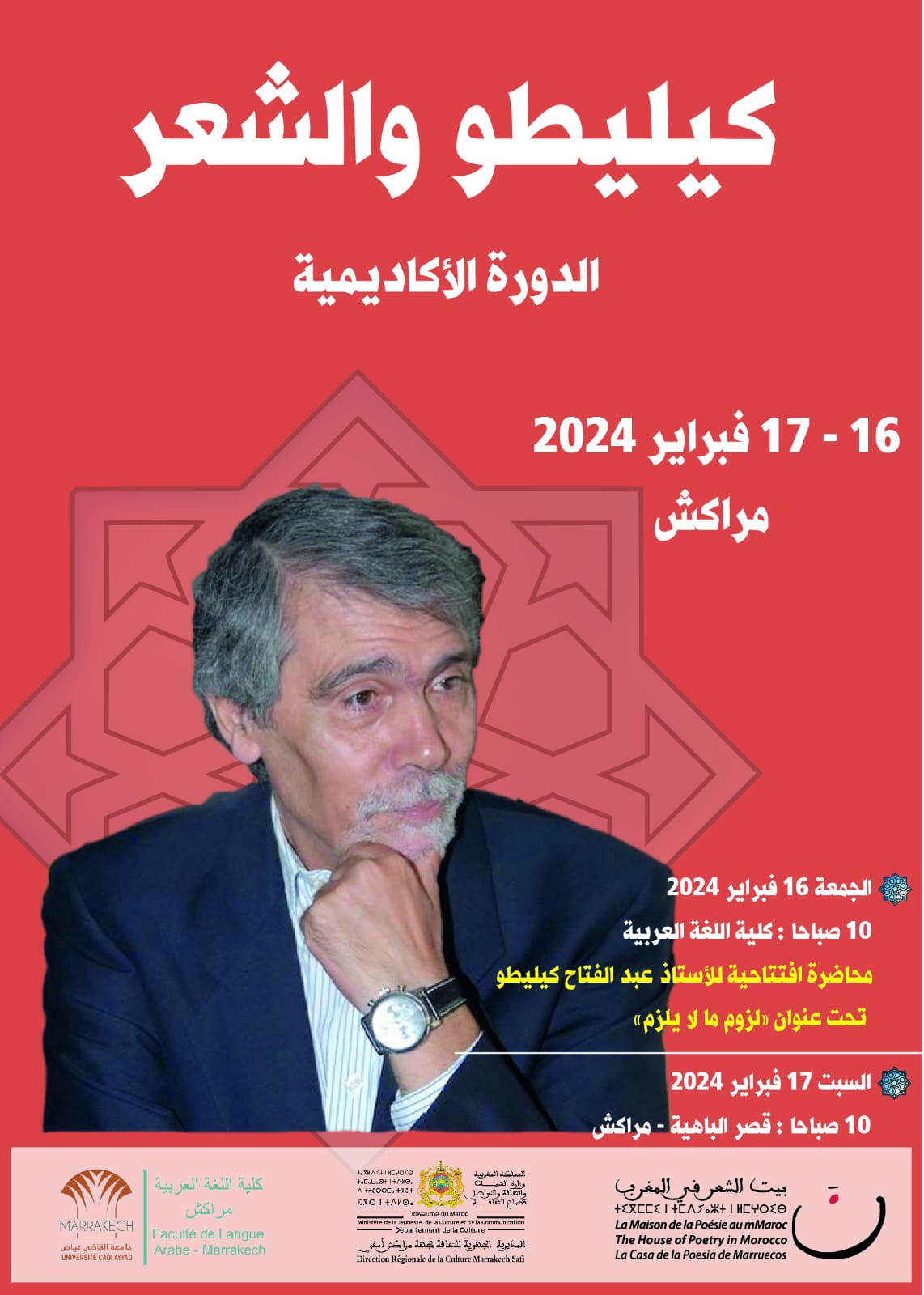 آربريس / احتفاءً بالمنجز الأدبي للأستاذ عبد الفتاح كيليطو، ينظّم بيت الشعر في المغرب بتعاونٍ مع كليّة اللغة العربية التابعة لجامعة القاضي عياض بمراكش، وبدعم من وزارة الشباب والثقافة والتواصل، والمندوبية الجهوية لقطاع الثقافة بجهة مراكش أسفي، الدورة الأكاديمية ” كيليطو والشعر“يومي 16 و17 فبراير 2024، وذلك بمشاركة عدد من الباحثين والأكاديميين المغاربة.