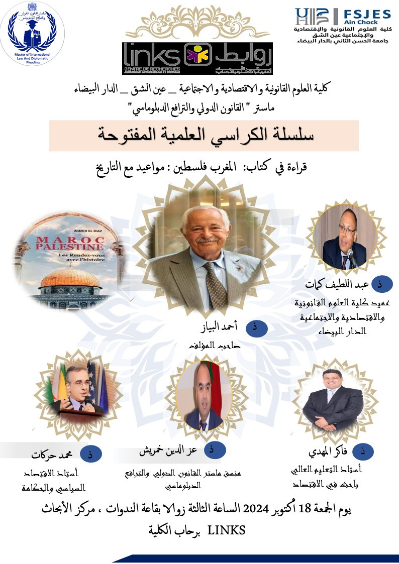 عائشة بوزرار / باحثة في الإعلام : استكمالا لسلسلة الكراسي المفتوحة لمركز الابحاث “روابط”، افتتح السيد عبد اللطيف كمات ،عميد كلية العلوم القانونية والاقتصادية والاجتماعية بالدار البيضاء،ندوة علمية (الجمعة 18 أكتوبر2024) ناقشت أهم المشاريع والانجازات التي تصب في عمق القضية الفلسطينية، وعلاقة المغرب مع دولة فلسطين من خلال تجربة واقعية واكبت إنجازات تقارب التجربة في العلاقات الدولية، والتي كانت فرصة للطلبة للتعرف على العلاقات المغربية الفلسطينية، وبتعليمات سامية من صاحب الجلالة الملك محمد السادس، تم تسجيل طلبة فلسطينيين في ماستر القانون الدولي والترافع السياسي، تثمينا للعلاقات التاريخية المغربية الفلسطينية.