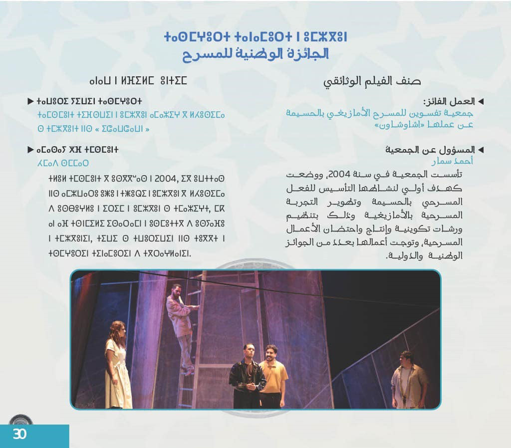آربريس/ بعد سلسلة النجاحات التي حققتها فرقة ثفسوين للمسرح بالحسيمة و ذلك من خلال اعمالها المسرحية الناجحة ، ها هي مرة أخرى تحرز على الجائزة الوطنية للثقافة الامازيعيةصنف المسرح التي يمنحها المعهد الملكي للثقافة الامازيغية كل سنة .