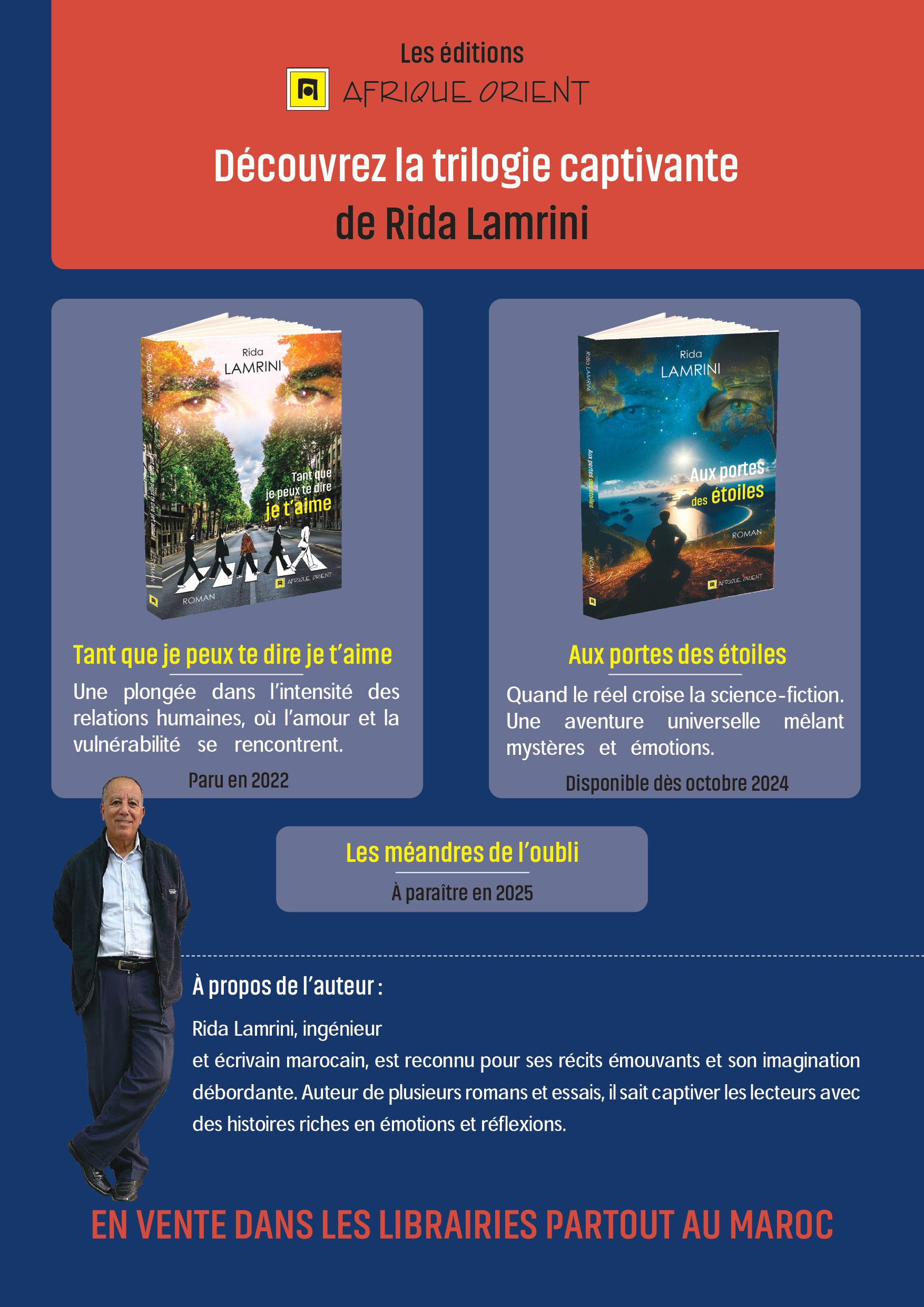 آربربس / بوشعيب خلدون : بإبداع يتجاوز حدود الخيال والتقاليد الأدبية، تصدر دار النشر أفريقيا الشرق ثلاثية الكاتب المغربي المرموق، رضى المريني. هذه الثلاثية الجديدة تضع القارئ أمام رحلة عاطفية وإنسانية عميقة، تعالج موضوعات الحب، الألم، الفقدان، والذكريات الغائرة في النفوس، مع مزج فريد بين الواقع والخيال.