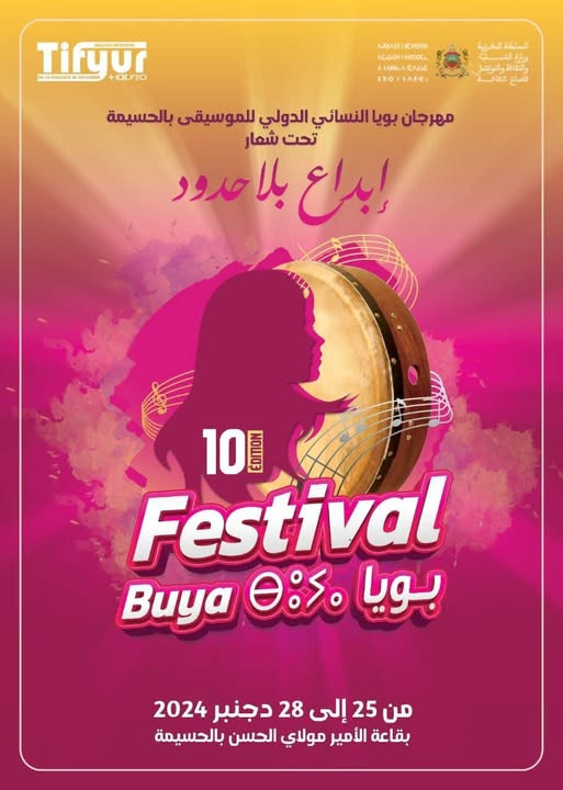 آربريس / بوشعيب خلدون : في بلاغ توصلت مجلة اربربس بنسخة منه، موقع من عبد العزيز البقالي رئيس جمعية تيفيور للموسيقى بالحسيمة وفي إطار الدينامية الثقافية والفنية التي تشهدها مدينة الحسيمة، واستمرارًا لدور جمعية تيفيور للموسيقى في دعم الإبداع النسائي ورعاية المواهب الشابة، يُسعدنا الإعلان عن تنظيم الدورة العاشرة لمهرجان “بويا” النسائي الدولي للموسيقى. سيُقام المهرجان في الفترة الممتدة من 25 إلى 28 ديسمبر 2024 بدار الثقافة الأمير مولاي الحسن بالحسيمة، تحت شعار: “إبداع بلا حدود”.