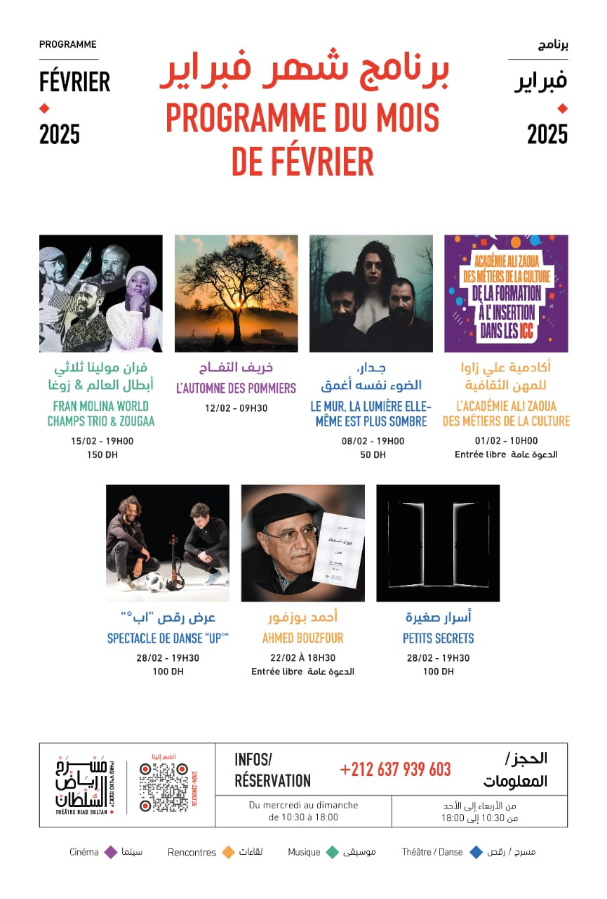 مع العرض السينمائي “خريف التفاح” بحضور مخرجه محمد مفتكر، حيث يتتبع هذا السرد الجذاب الصبي الصغير سليمان، وهو يبحث عن الحقيقة حول تاريخ والدته، مما يمزج ببراعة بين الواقع والخيال لاستكشاف الروابط الأسرية والأسرار المدفونة. ومن السينما إلى الموسيقى سيحلق مسرح رياض السلطان بجمهوره ليلة السبت 15 فبراير، في سفر موسيقي بين الجاز والفلامنكو وموسيقى العالم برفقة الثلاثي الإسباني فران مولينا وورلد تشامبس والمغنية الكاميرونية نيللي زوغا. يثري هذا الثلاثي الموهوب ريبيرتواره بإيقاعات وألحان عالمية مستقاة من أعماق الأدغال وهي تتغنى بأنفاس الشعوب المنهوكة.