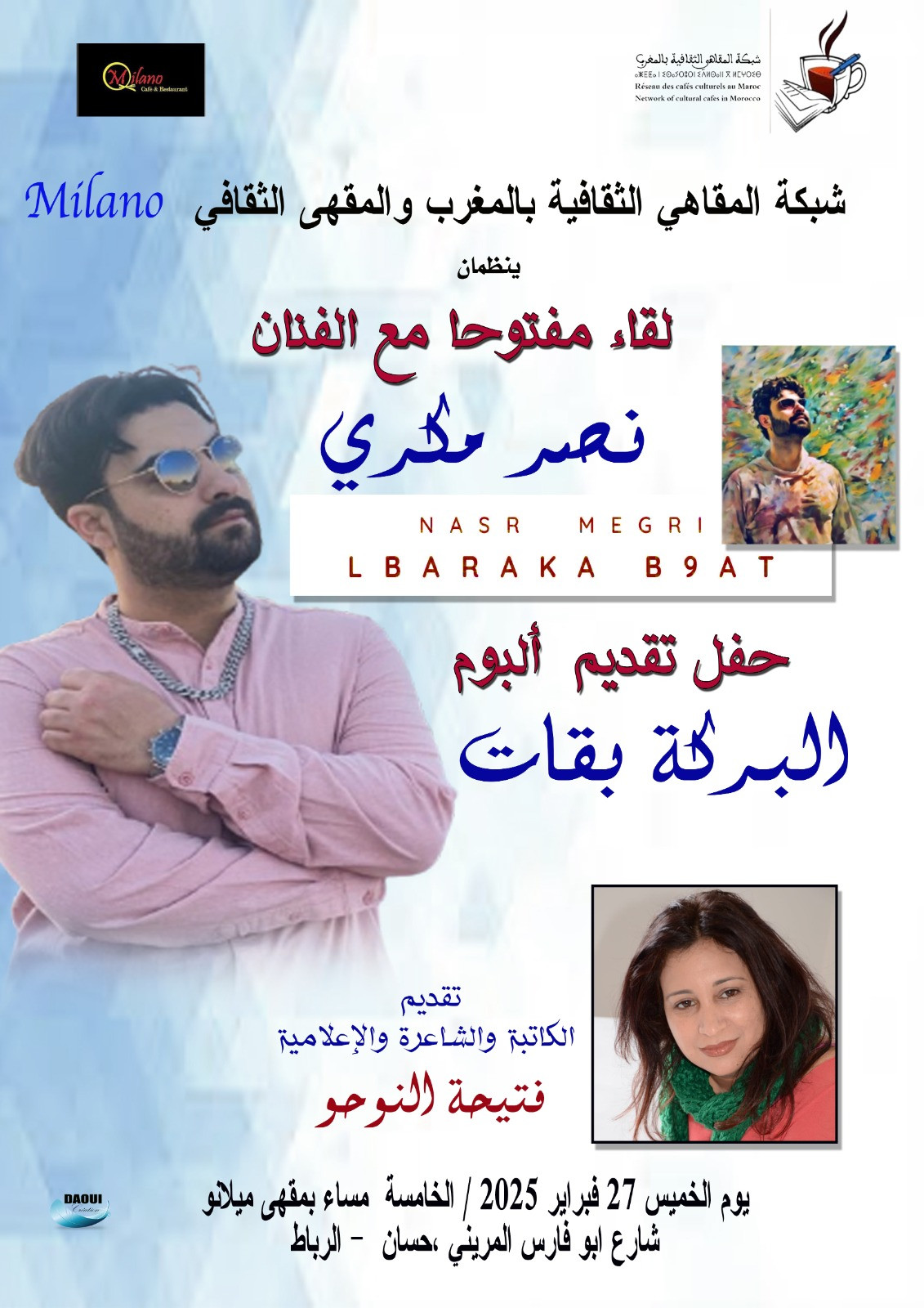 آربريس/ تنظم شبكة المقاهي الثقافية بالمغرب والمقهى الثقافي ميلانو لقاءا مع الفنان نصر مكري وذلك لتقديم ألبومه الجديد “البركة بقات”. تقدم اللقاء الكاتبة و الشاعرة والاعلامية فتيحة النوحو ويشرف عليه الاخوين عزيز كوغري ونوردين اقشاني.