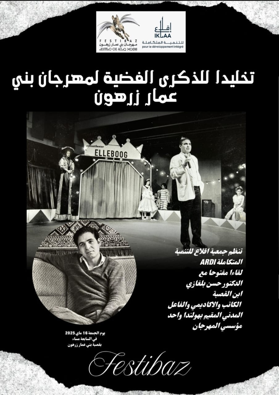 آربريس/ تخليدا للذكرى الفضية لمهرجان بني عمار زرهون (FestiBaz)، تنظم الجمعية إقلاع للتنمية المتكاملة (ARDI)، مساء يوم الجمعة 16 ماي 2025, ابتداء من السادسة بمقرها الكائن بمدخل بني عمار، لقاءا مفتوحا مع الدكتور حسن بلغازي ابن القصبة واحد مؤسسي المهرجان، الأكاديمي والكاتب المقيم بهولندا.